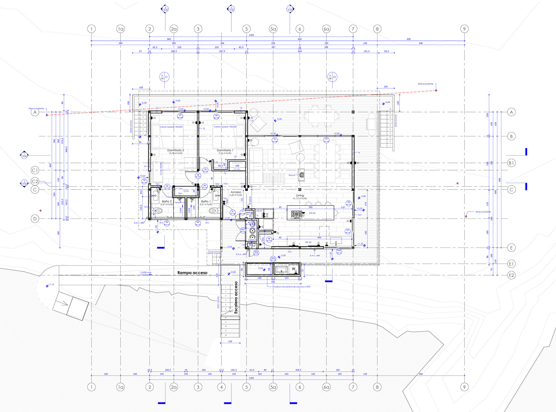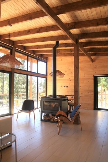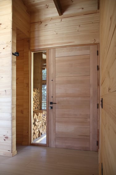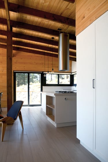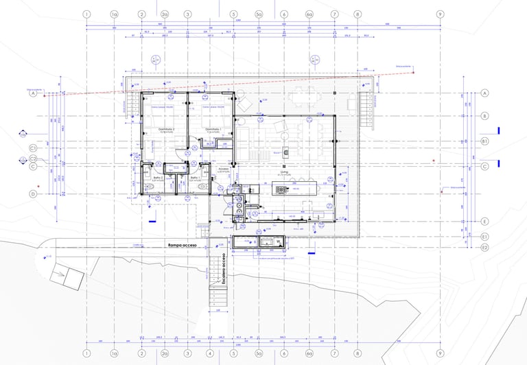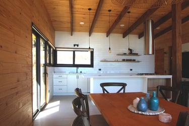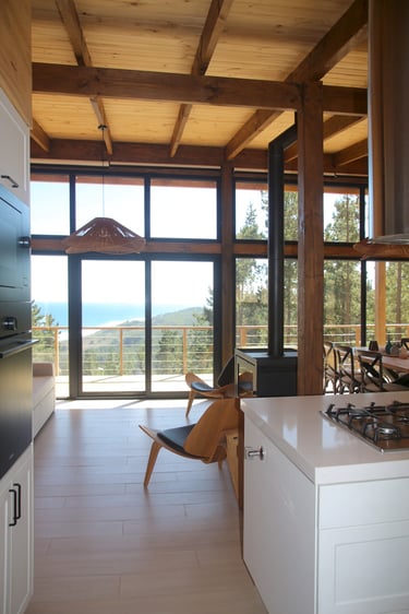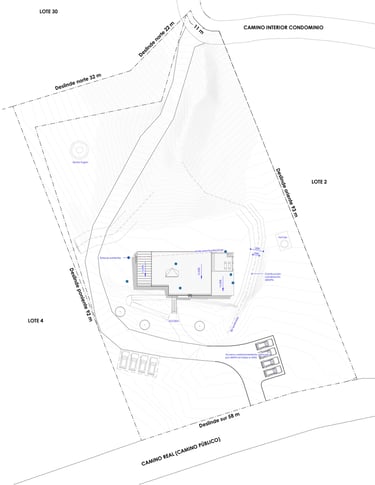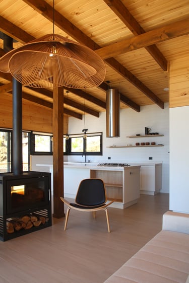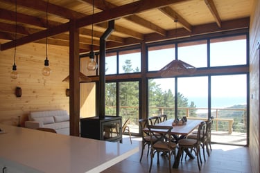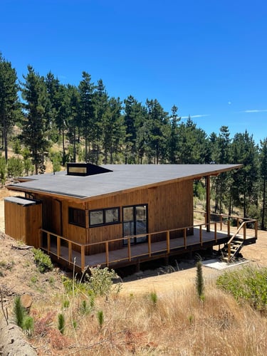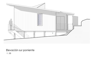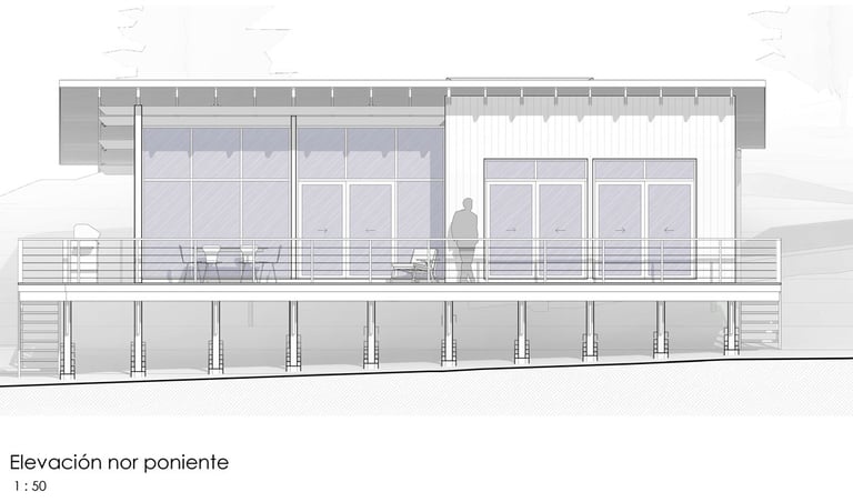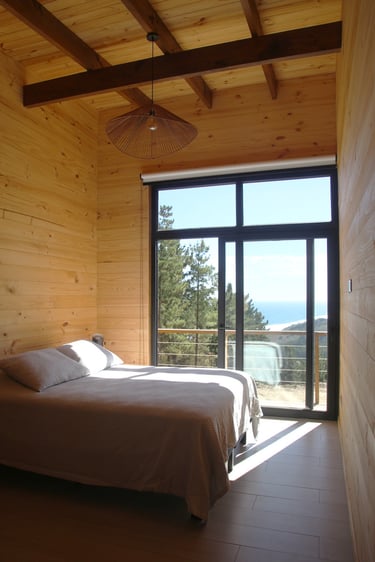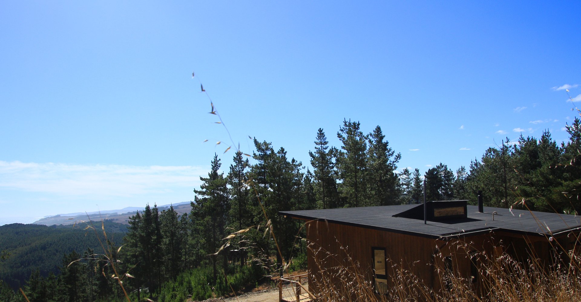Diseño de vivienda vacacional sobre un terreno en pendiente, previamente aterrazado, en medio de una antigua plantación de pinos. La casa se construye en madera, priorizando un gran espacio familiar de estar y cocina con terraza y vista despejada al océano. El bloque de dormitorios se desplaza respecto al espacio principal para articular el acceso, producir la terraza y lograr privacidad entre ambas zonas.