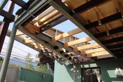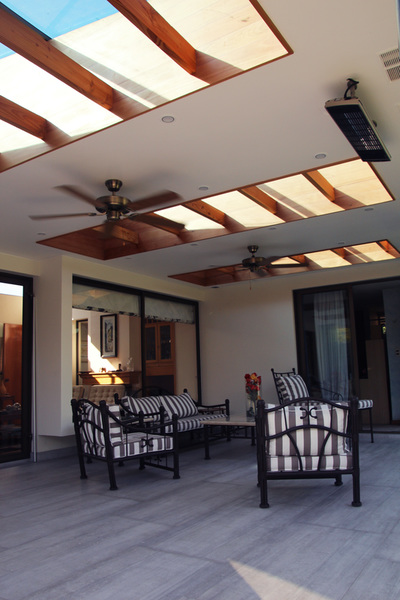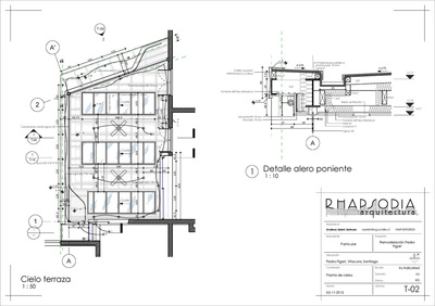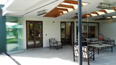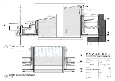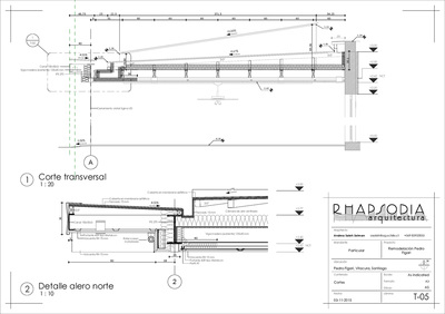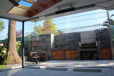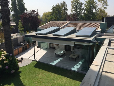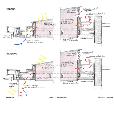 La situación existente resultaba en una pésima habitabilidad en términos de luz y calor. En verano la orientación y la alta radiación solar bajo una cubierta de policarbonato y un piso brillante potenciaban el efecto de calor y encandilaban el recinto en la tarde. Los recintos contiguos (living, comedor y dormitorio) recibían poca luz durante el día. La estrategia que se tomó para mejorar el confort térmico en ambas estaciones se basa en dos condiciones principales: La creación de un techo ventilado y de baja tramitancia térmica (<0,30 W/m2K); y la utilización de una “cortina” de cristal colgante, que aísla el recinto en invierno y desaparece en verano, permitiendo el efecto invernadero en invierno y la ventilación del recinto en verano. En términos lumínicos se decidió combinar el techo ventilado con grandes rasgos de vista y luz cenital. Se utilizaron cristales templados tinteados, para mejorar la entrada de luz y la vista hacia el exterior, controlando el ingreso de calor y radiación solar directa. |