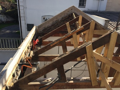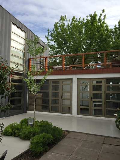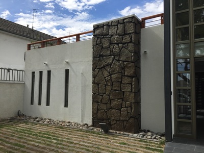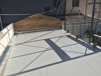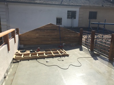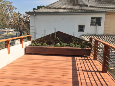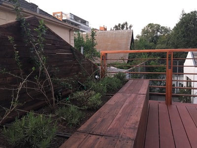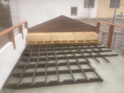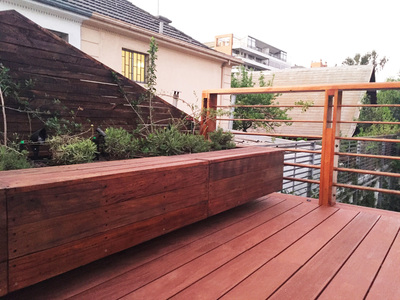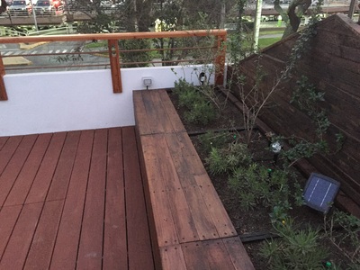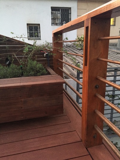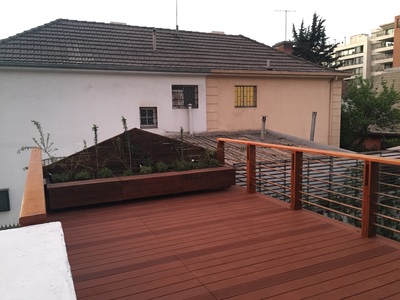 Para asegurar la estanqueidad de la terraza, se construye un entrepiso en acero sobre el cual se genera una "piscina" impermeable sin perforaciones. Sobre esta piscina se apoyan pallets especiales con deck de terminación. Estos pallets son modulares y completamente desmontables, para la futura limpieza y mantenimiento de la cubierta impermeabilizada. Se mantiene el tímpano original contra el vecino, agregando jardineras modulares y un revestimiento en madera reutilizando en un 100% la madera retirada de la cubierta original. Se agrega además iluminación led y riego de mínimo consumo para mantener plantas nativas del valle central, idóneas para el clima y la orientación. |